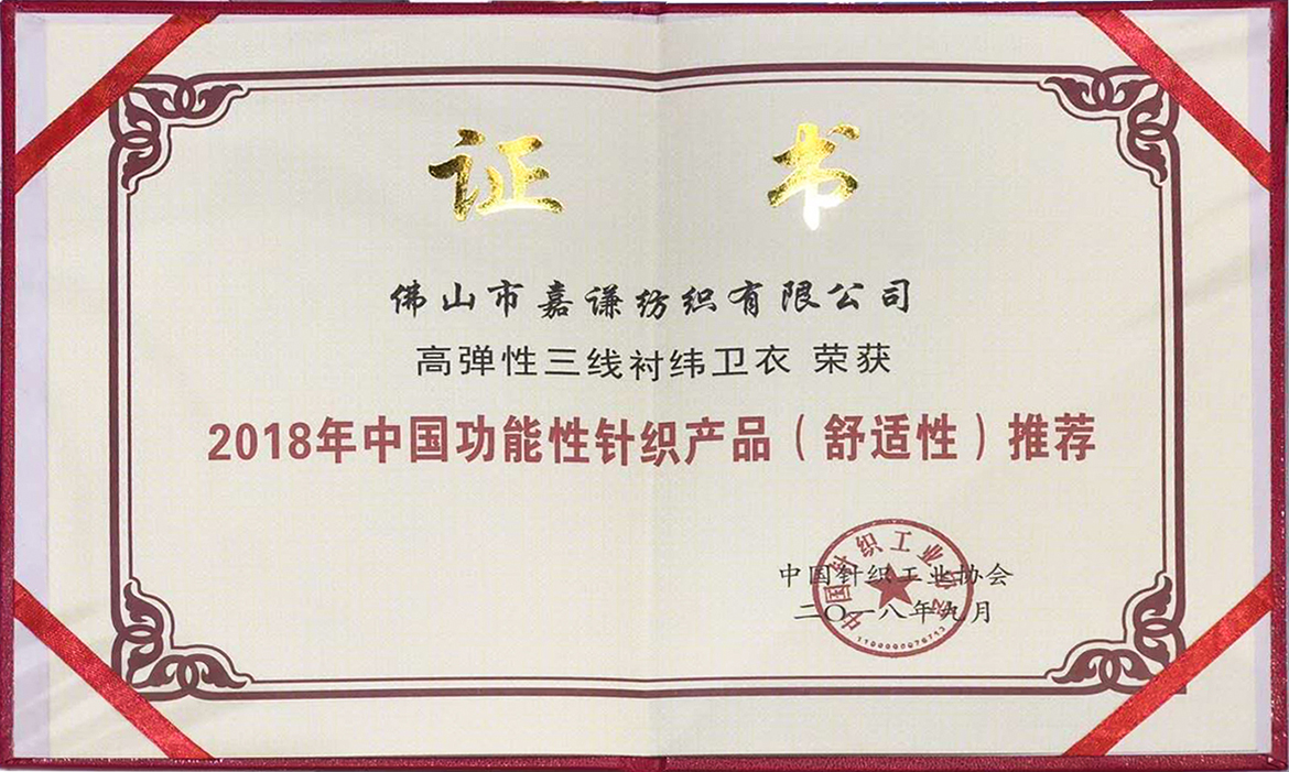 佛山市嘉謙紡織有限公司——高彈性三線襯緯衛(wèi)衣榮獲2018年中國(guó)功能性針織產(chǎn)品(舒適性)獎(jiǎng)