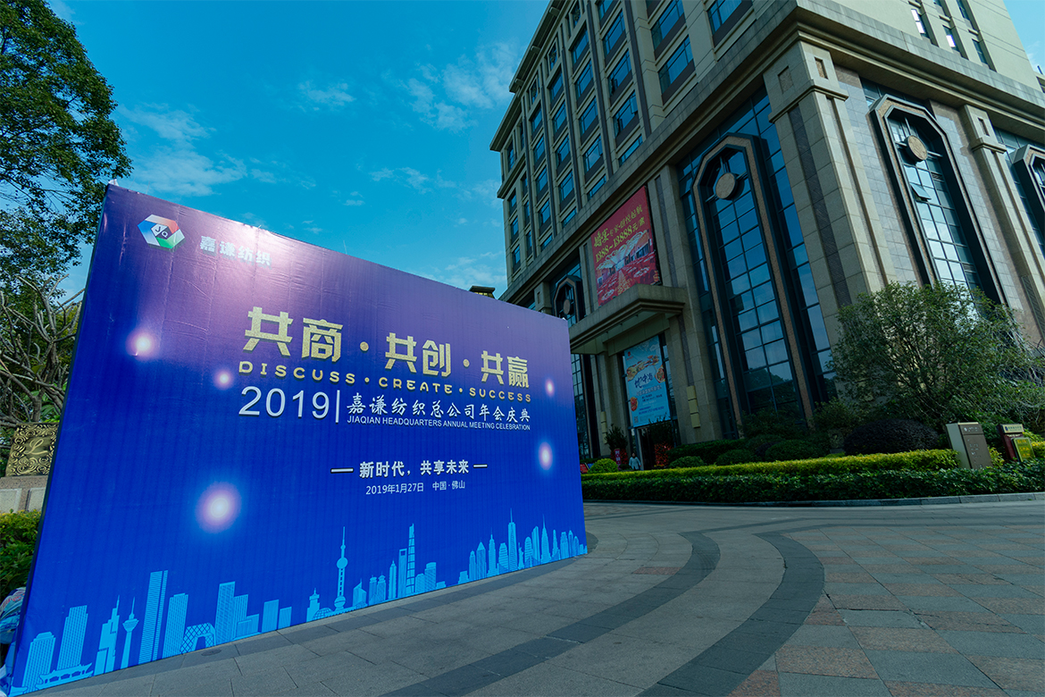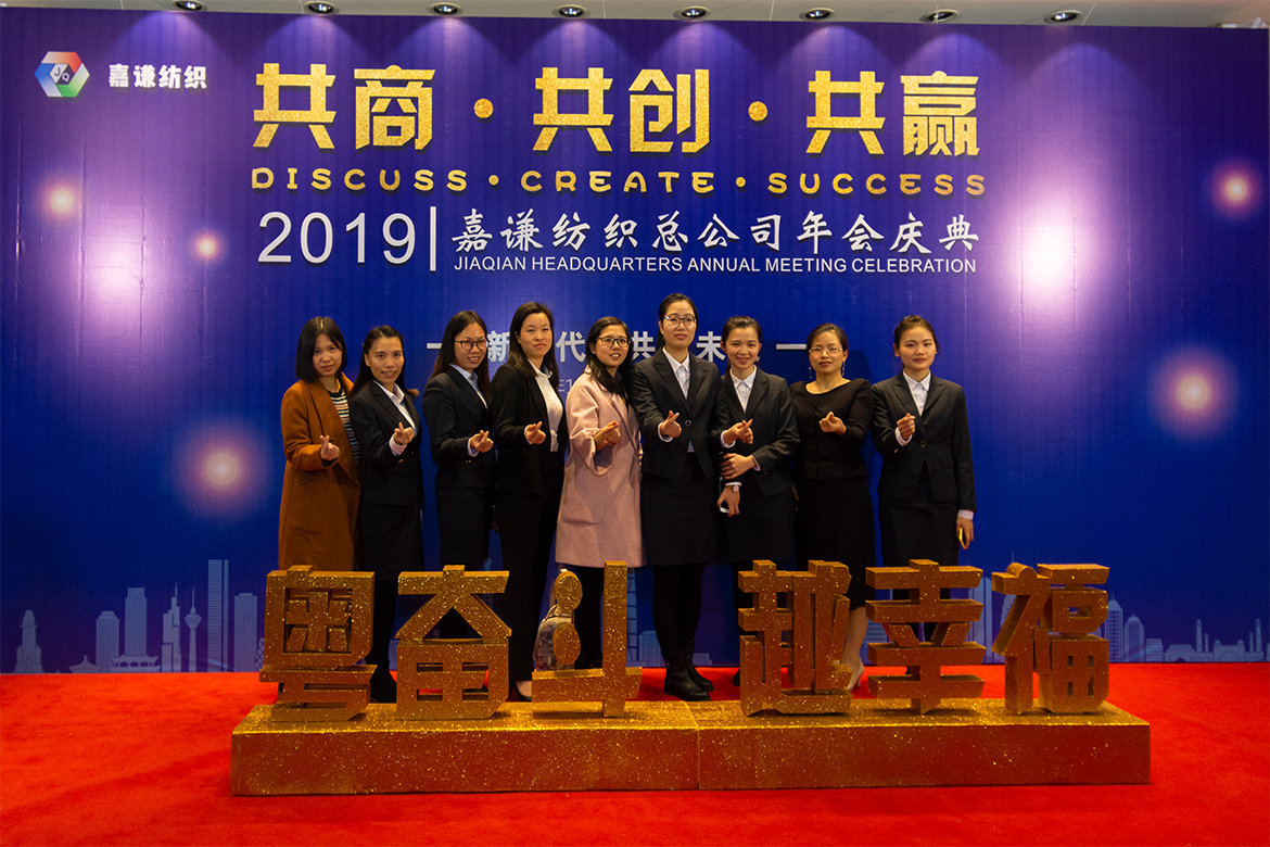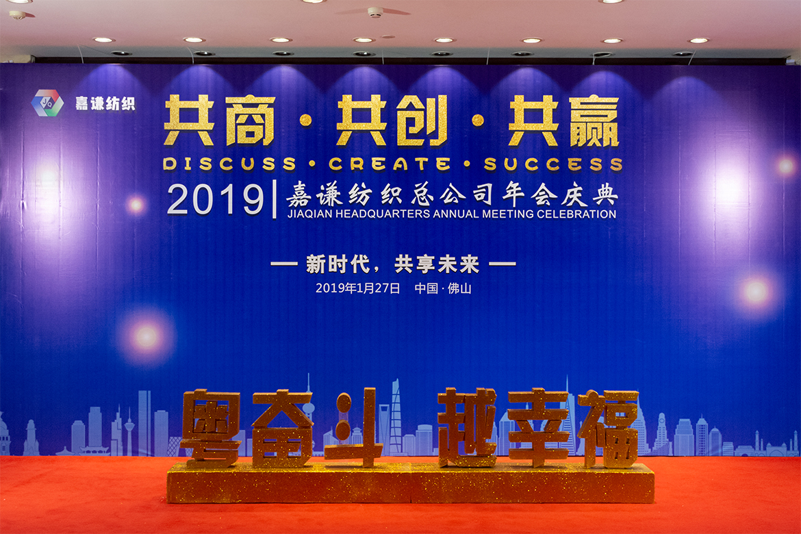 2019年1月27日,以“共商·共創(chuàng)·共贏”為主題的嘉謙紡織總公司年會慶典在富林朗悅酒店盛大舉行,廣東省紡織協會會長羅碚先生、中國針織T恤衫分會會長蔡劍華先生、廣東省軍區(qū)原副司令員倪增先生、優(yōu)秀戰(zhàn)略合作伙伴等特邀嘉賓,以及公司董事長蔡景輝先生、總經理羅椿女士攜各銷售分公司、部門經理、全體同事參加了晚會慶典。